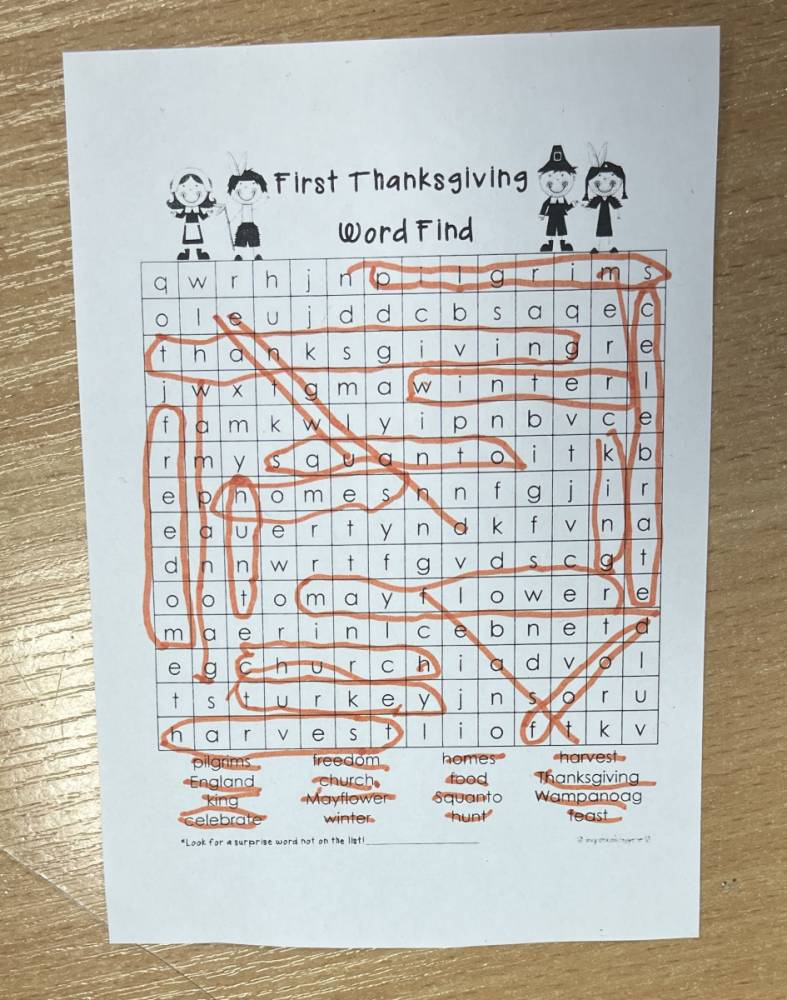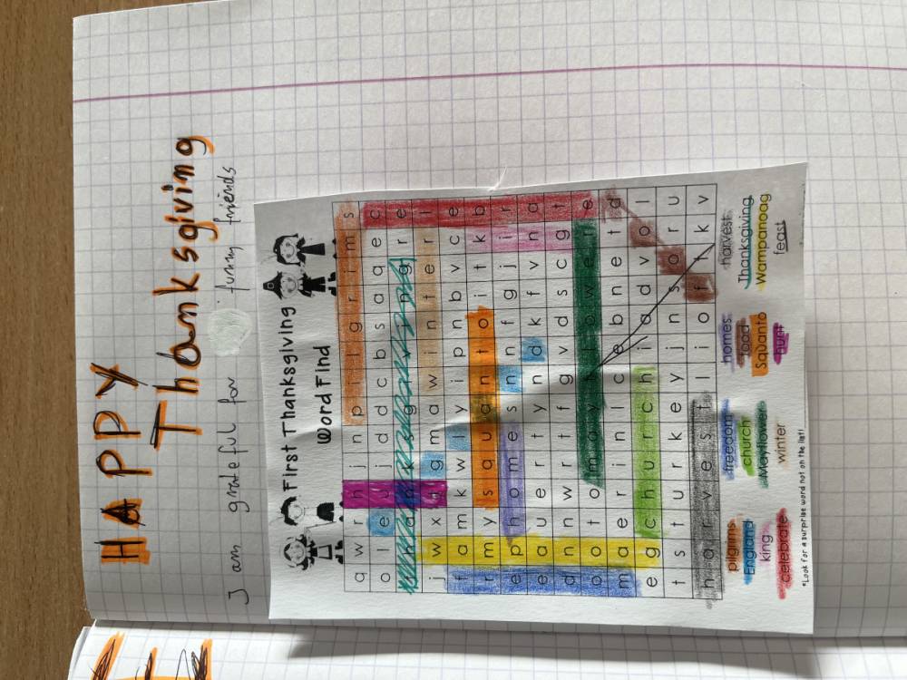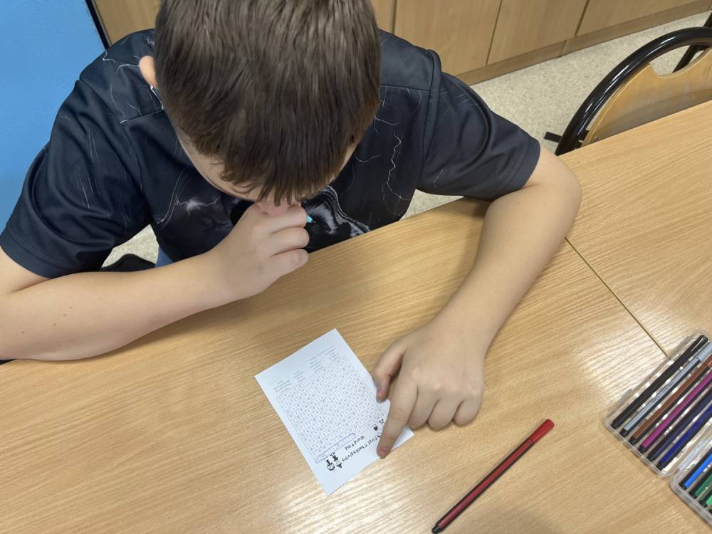 Podczas zajęć nie zabrakło również elementów zabawy i kreatywności. Uczniowie rozwiązywali wykreślankę tematyczną, wyszukując słownictwo związane z Thanksgiving, a także układali krótkie historie, wykorzystując nowe poznane słowa. Na zakończenie cała grupa wspólnie zaśpiewała piosenkę o Święcie Dziękczynienia, wprowadzając radosną i pełną ciepła atmosferę.
