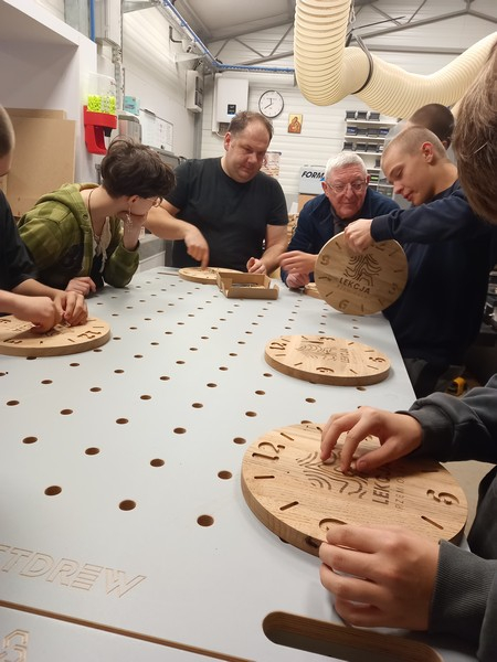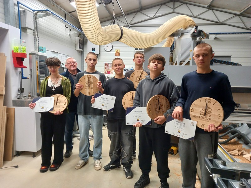 W piątek 31 października grupa ósmoklasistów udała się na wycieczkę edukacyjno-zawodową do Chrząszczyc na niezwykłą Lekcję Rzemiosła „Od pomysłu do projektu-cyfrowa rewolucja w warsztacie stolarskim”. Organizatorem warsztatów była firma „Stolarstwo Sadło”. Pod okiem mistrza pana Henryka i pana Bartłomieja - właściciela zakładu, tradycyjne rzemiosło spotkało się z nowoczesną technologią, a teoria zamieniła się w praktykę. Najpierw była prezentacja projektu na ekranie, a potem zajęcia praktyczne. Poszły w ruch: frezarka, wiertarki, suwmiarka i laser do wypalania. Efektem końcowym pracy każdego uczestnika był drewniany zegar. Wszyscy dumni ze swojej pracy zabrali zegary do domów.