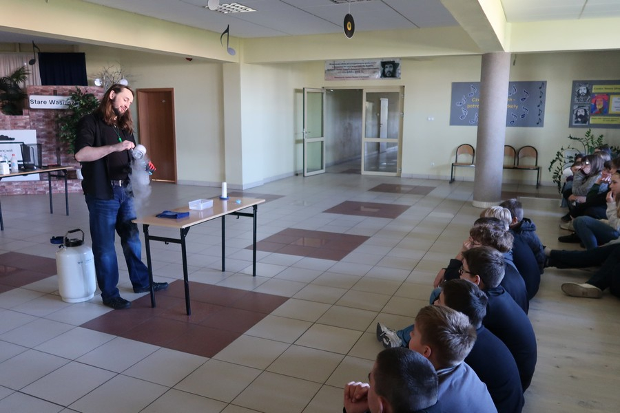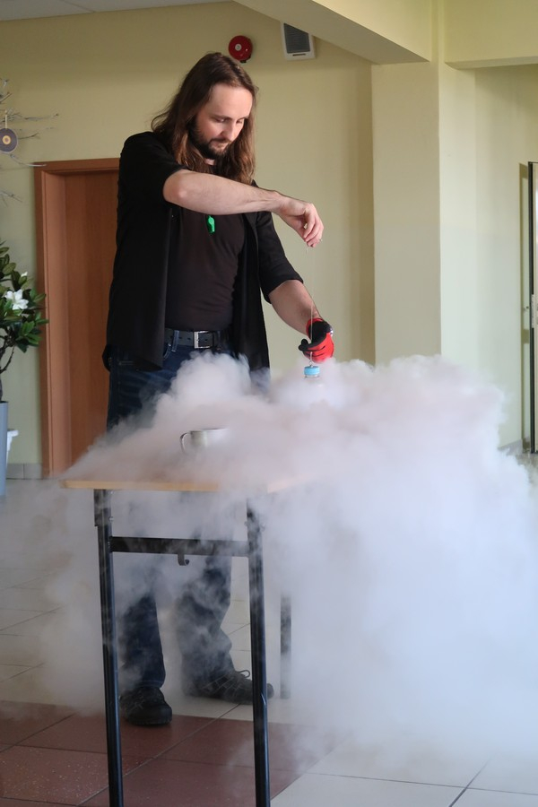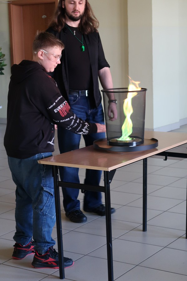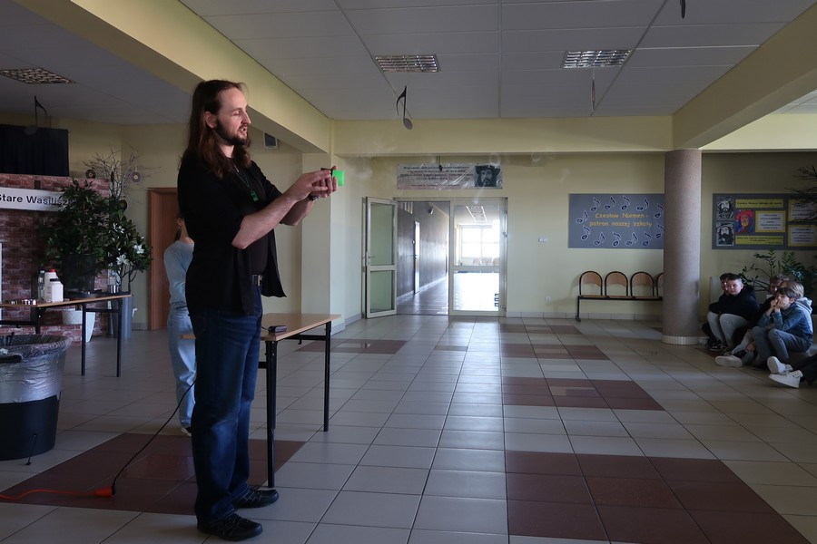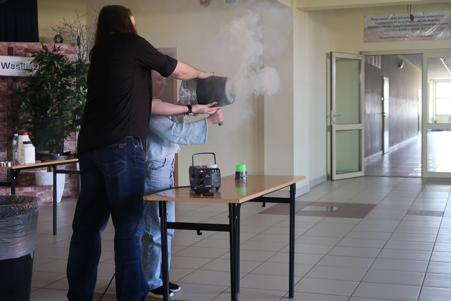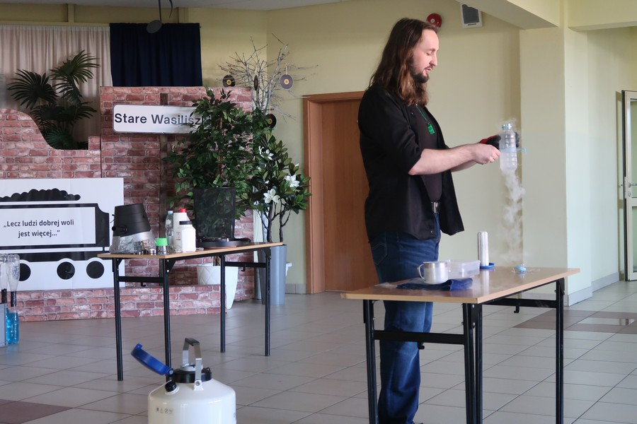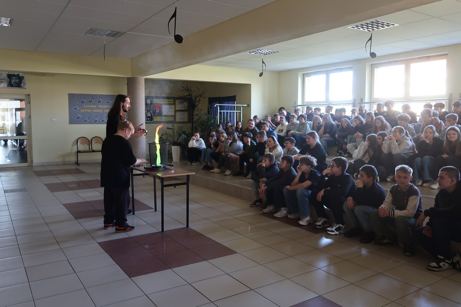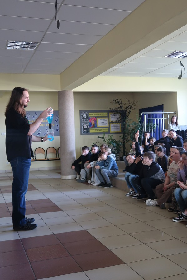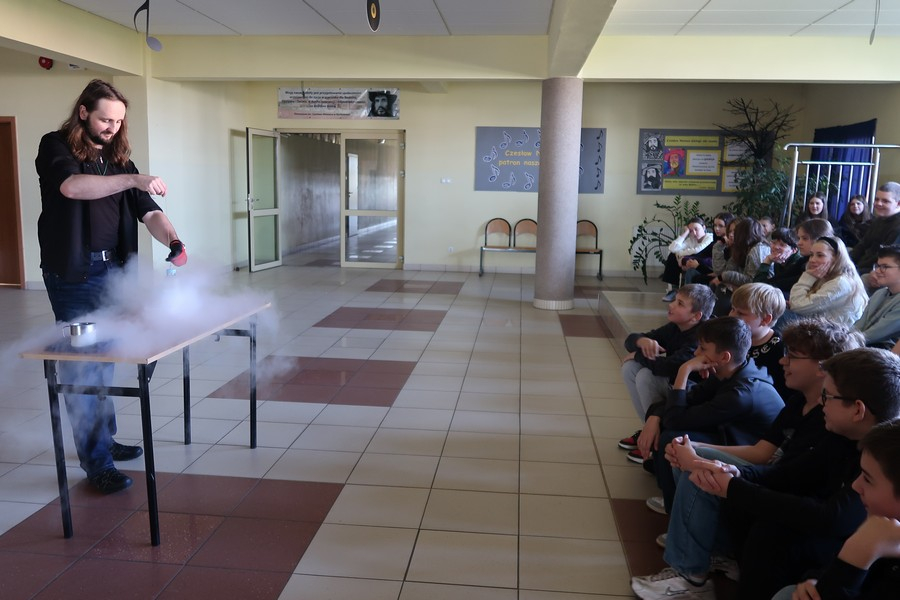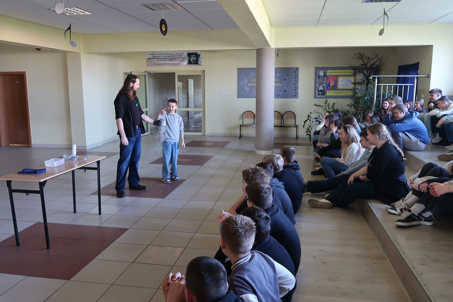 Pokaz cieszył się ogromną popularnością wśród uczniów, którzy z dużym zainteresowaniem obserwowali prezentowane doświadczenia. Mateusz Łucki w ciekawy i przystępny sposób zaprezentował nowe eksperymenty, angażując młodzież i zachęcając do odkrywania tajemnic nauki.