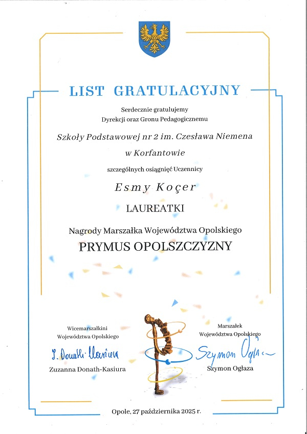 27 października 2025 r. w Teatrze im. Jana Kochanowskiego, miała miejsce gala z okazji Regionalnego Święta Edukacji. Podczas uroczystości wręczane są Nagrody Marszałka Województwa Opolskiego „Prymus Opolszczyzny”. Wyróżnienia przyznawane są uczniom, którzy osiągają najwyższe wyniki w nauce oraz odnoszą sukcesy w olimpiadach przedmiotowych, konkursach, turniejach, przeglądach czy festiwalach.