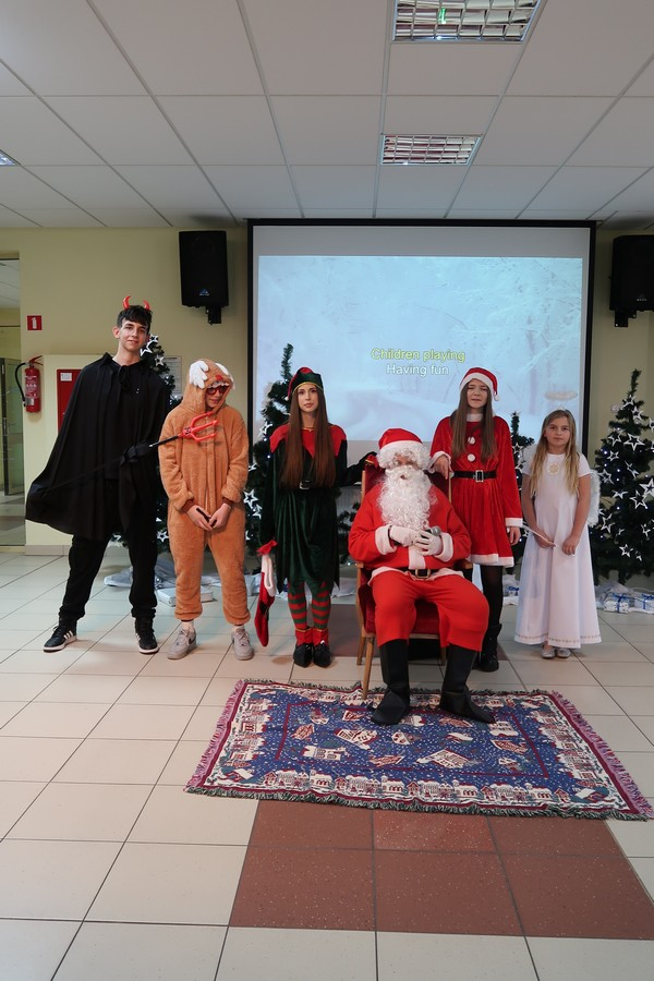 Spotkanie odbyło się wspólnie ze wszystkimi uczniami i pracownikami szkoły w holu. Mikołaj wraz z pomocą swojej barwnej świty opowiedział o dobrych uczynkach, życzliwości i sile otwartego serca.
