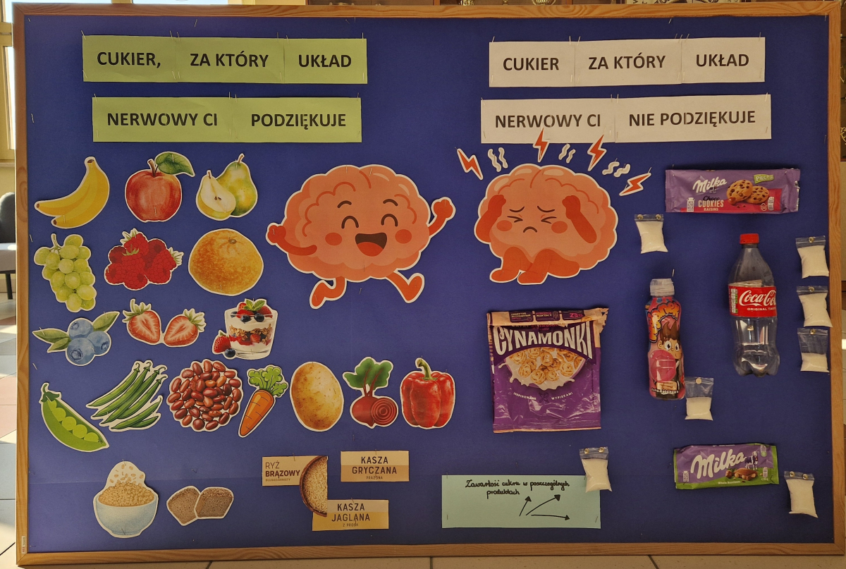 W ubiegłym tygodniu obchodziliśmy w szkole Europejski Dzień Mózgu. Z tej okazji w poniedziałek w bibliotece szkolnej dla chętnych uczniów został wyświetlony film animowany dot. pracy układu nerwowego i tego jak ważną rolę pełni mózg dla funkcjonowania człowieka, ze zwróceniem uwagi jak dbać o jego sprawność. W projekcji filmu uczestniczyło około 30 osób. W środę na każdej przerwie w gabinecie psychologa szkolnego organizowane były „Łamigłówki młodej główki”. Chętni uczniowie przychodzili potrenować swoje procesy poznawcze. We współpracy z uczniami powstała także gazetka edukacyjna nt. właściwych i nieodpowiednich dla układu nerwowego źródeł cukru. Układ nerwowy i jego zarządca – mózg, potrzebują tej substancji do ich prawidłowej pracy. Warto jednak zadbać o to, aby cukier ten pochodził z dobrych źródeł i odpowiednich grup produktów. Źródła cukru rafinowanego, których przykłady zaprezentowane są po prawej stronie gazetki, nie są odpowiednim paliwem dla naszego układu nerwowego i wpływają negatywnie na jego pracę – m.in. na zdolność koncentracji uwagi, myślenie, zachowanie, naukę.